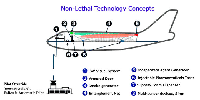 The possibility of using anesthetics to fight aircraft hijackers was discussed again in the early 2000s. In 2001, at a briefing for the International Air Line Pilots Association (ALPA), a concept was presented for an aircraft hijacking countermeasure system in which the passenger cabin and pilot cockpit had separate isolated air supply systems, and in case of terrorists in the cabin, they, along with passengers, could be put to sleep using aerosol or gaseous anesthetic[45]. After the September 11, 2001 terrorist attacks, this idea was further developed and planned to include remote flight control and landing from the ground, armored doors, movement-restricting nets, smoke and adhesive foam generators, sirens, and of course, sleeping agents not only in aerosol form but also in "flying syringes"[46].