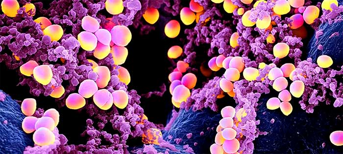A colorized electron microscope image captures a Staphylococcus aureus bacteria colony.