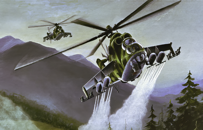 U.S. military analysts' interpretation of a chemical weapons deployment utilizing Soviet Mi-24 "Hind" helicopters