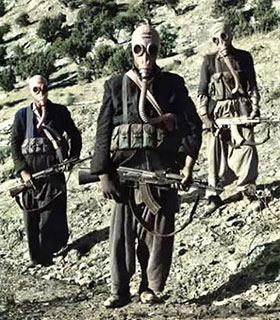 Afghan mujahideen posing in gas masks captured from the Soviet Army