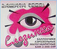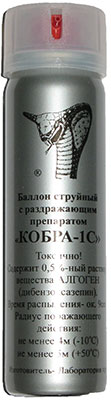 Струйный баллон «Кобра–1С». Для применения в закрытых и многолюдных помещениях (лифт, автобус и т. п.). Создает тонкую прицельную струю раздражающего препарата длиной не менее 5 метров. Для мгновенного поражения противника обязательно попадание струи в глаза. Попадание на другие части тела вызывает сильнейшее чувство жжения, но боеспособности не лишает. Препарат ветром не разносится, на близко стоящих людей влияния не оказывает. В состав растворителя входит ДМСО. Объем баллона 120 мл. В настоящее время не выпускается.
