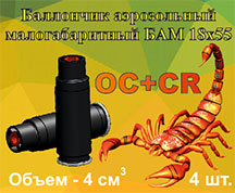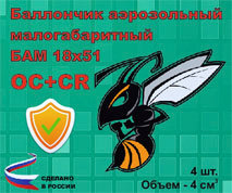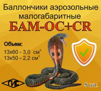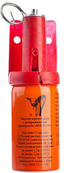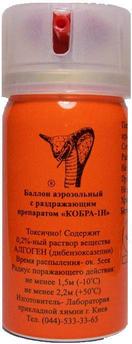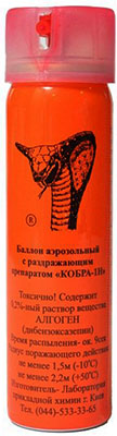 Аэрозольный баллон «Кобра–1Н». Создает мощный широкий факел аэрозоля длинной до 2,7 м. Содержит 0,2% раствор вещества CR. Выпускается двух объемов 65 мл и 120 мл. Время непрерывного распыления 5 сек.