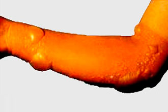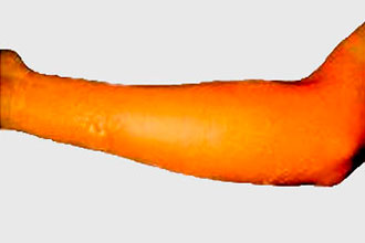 На фотографиях, слева — эритема через 25 часов после воздействия CS в концентрации 14 040 мг·мин/м3 в условиях высокой температуры и повышенной влажности. Справа — та же самая конечность через 45 часов после поражения[36].