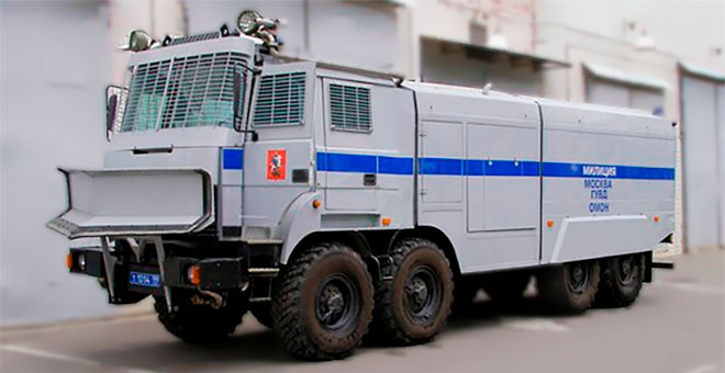 Разработана рецептура для водометной машины «Лавина-Ураган» (на фото), состоящей на вооружении МВД России, с концентрацией 0,01-0,02% вещества CS в струе. Емкость бака 6000 литров, максимальная дальность подачи воды — 60 метров[38].