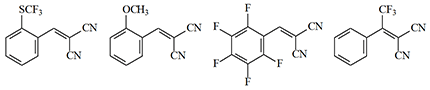 В 1973 году Y. Alarie опубликовал данные об активности 27 респираторных ирритантов содержащих C=C(CN)2 группу. Среди полученных соединений только семь превосходили CS в тесте респираторной депрессии у мышей (слева направо в порядке возрастания активности).[25]