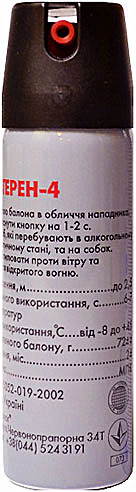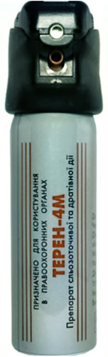 Газовый баллончик «Терен-4М» — предназначен для использования правоохранительными органами в качестве средства активной обороны. Содержит 3% раствор МПК и 0,7% раствор CS. Дальность поражения — до 3 метров. Время непрерывного использования — 6–7 секунд.