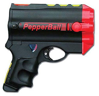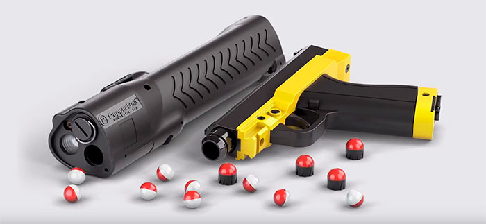 Pepperball is another type of less-lethal weapon. The name Pepperball comes from its projectiles - plastic balls containing the irritant PAVA (Capsaicin II). When hitting a person, the shell of such a ball breaks, releasing the irritant. Compressed gas (CO2) is used to propel the projectile.