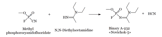 Бинарную версию А-232, также известную как система компонентов «Новичок-5», разработали Игорь Васильев и Андрей Железняков из ГосНИИОХТ в Москве. Исходными компонентами для синтеза A-232 и его бинарной формы «Новичок-5», являются O-метилцианофторфосфонат и N,N-диэтилацетамидин[23].