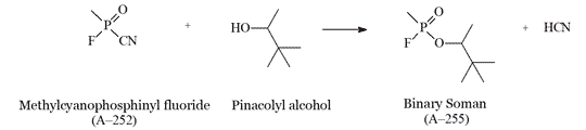 СССР-Россия. Первые исследования по разработке бинарных ОВ веществ из группы G-газов были выполнены в 1971–1972 годах в ГСНИИХТе под руководством профессора С. З. Ивина. Проект получил шифр «Хорек»[23]. Вместо метилфосфонилдифторида (DF) в качестве прекурсора был выбран метилцианофторфосфинат (A-252). Скорость протекания реакция была достаточно высокой, выход зарина превышал 80%. По аналогичной схеме получают и бинарный зоман: