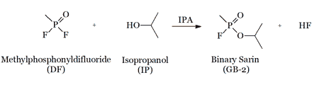 США. Для боеприпасов с бинарным зарином (GB-2) была выбрана реакция между метилфосфонилдифторидом (DF) и изопропиловым спиртом (IP). Продолжительность такой реакции около 10 секунд, а доля зарина в конечной смеси составляет примерно 70%[11].