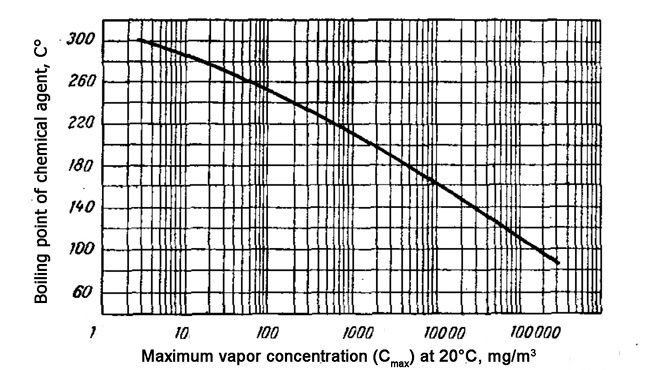Relationship between boiling point and saturation concentration (taken with changes, S. Franke. Lehrbuch der Militärchemie, Band l, DDR. )