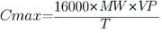 where Cmax — maximal volatility (mg/m3), MW — molecular weight, VP — saturated vapor pressure (mm Hg or torr), T — temperature K° (°C+273.15)