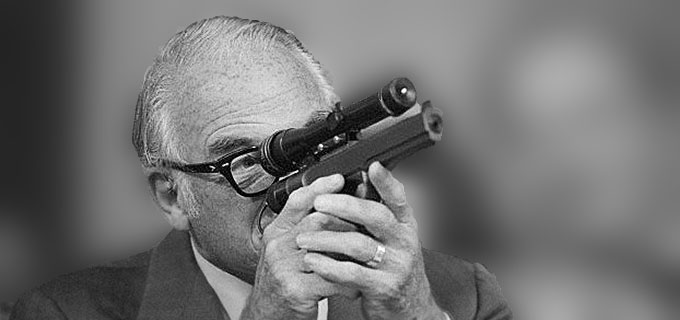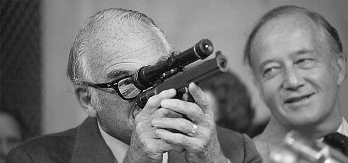 Senator Barry Goldwater considers the M-1 electric pistol for firing tranquilizing or lethal needle bullets (U.S. Senate hearings, 1975)