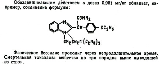 The formula of another incapacitant from the benzimdazole group is given in a Soviet textbook on military toxicology, without reference to the source. The authors of the textbook state that this drug has an immobilizing effect at a dose of 0.001 mg/kg and that its "toxodose is three orders of magnitude higher than the incapacitating one"[6].