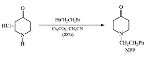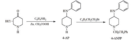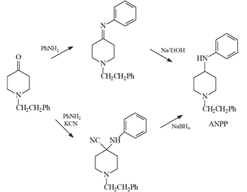 P. K. Gupta et al. (2010) from the Indian Defense Research and Development Organization (DRDO) developed a method for synthesizing 4-ANPP from 4-piperidone and aniline, followed by the reaction of 4-anilinopiperidine with 2-phenethyl bromide.[59]