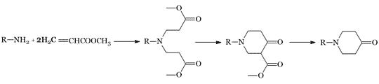 N-Phenethyl-4-piperidone (NPP).The starting materials for the most widely used method for the synthesis of fentanyl and its derivatives is N-phenethyl-4-piperidone (NPP) or 1-benzyl-4-piperidone. These compounds are obtained from the corresponding amine and methyl acrylate. The resulting diester is cyclized, hydrolyzed, and decarboxylated. The 3-methylfentanyl is prepared in a similar fashion — the amine first reacts with methyl methacrylate, followed by methyl acrylate.[50]