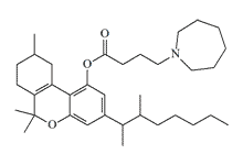 Nabitan (A-40656, SP-106, BW146Y). Азаканнабиноид, водорастворимый эфир ADL 226169. Изучался в качестве средства для лечения глаукомы. В дозе 4 мг, у четырех из девяти испытуемых вызывал оглушение, головокружение, нарушение ориентации и «опьянение». При дозе 12 мг, два из трех испытуемых жаловались на сильное головокружение, одному из них потребовалась госпитализация из-за обморочного состояния[83]. Еще в одном исследовании прием набитана в дозе 10 мг и выше вызывал у испытуемых марихуаноподобные эффекты[52]. 1-метилпиперидил гомолог набитана — Menabitan (SP-204) проходил испытания как противоглаукомное средство[104] |