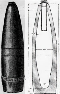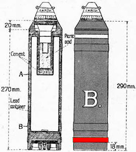 | Французский артиллерийский снаряд с йодацетоном | 76 мм немецкая мина с бромметилэтикетоном |